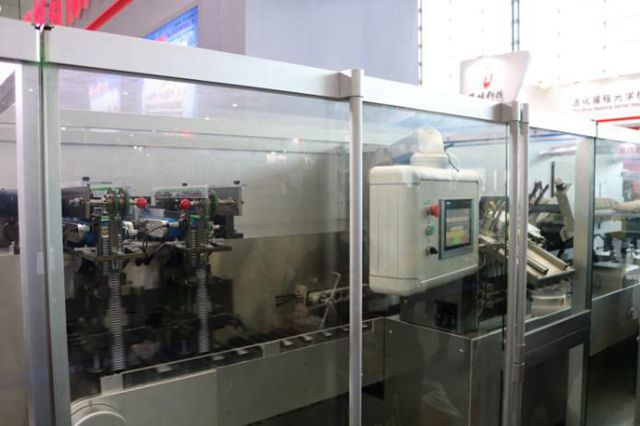“DHL700全伺服高速泡罩裝盒一體機速度可達700板/分鐘及400盒/分鐘,通過公司自主研發(fā)的IRB24智能機器人追蹤移送系統(tǒng)將格柵輸送上的泡罩板轉(zhuǎn)送到并行的裝盒機料倉輸送上,這種輸送方式不僅縮短了流水線長度,而且生產(chǎn)效益(OEE)得到升級,穩(wěn)定性得到保障,以及結(jié)合多道格柵輸送,能夠?qū)崿F(xiàn)多板的疊加。”現(xiàn)場工作人員介紹,DHL700全伺服高速泡罩裝盒一體機還可實現(xiàn)內(nèi)外包隔離生產(chǎn),突破了此種機型國際同行目前格柵輸送內(nèi)外包互通的狀況,給藥品包裝帶來安全保障。